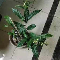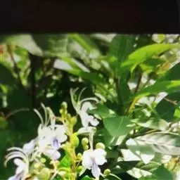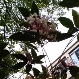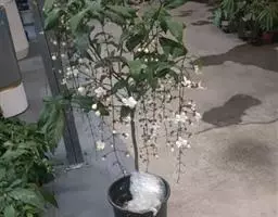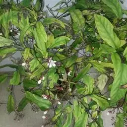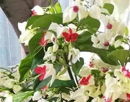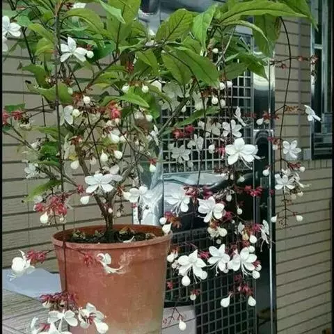 烟火树,为唇形科(原马鞭草科)大青属小灌木。学名:Clerodendrum quadriloculare (Blanco) Merr.,别称:星烁山茉莉。株高50一60厘米,栽培当年6一n月花开不断,聚伞形花序,顶生,众多,花筒紫红色,前端炸开五片洁白耀眼的长型花瓣,花色绚丽多彩,好似繁星闪烁,犹如“团团烟火”,吐露的花蕊金丝银柳一般,微笑一吹弹跳起舞不停,该树除观赏价值极高外,它的根还具有舒肝理气、益肾填精、养胃和中、补血调经等功效,主治肝气不舒。