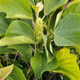 落叶小乔木或灌木,高2-7米;树皮灰褐色,小枝密生硬毛。叶厚纸质,倒卵状椭圆形,长7-20厘米,宽3-9厘米,先端短渐尖,基部圆形至浅心形,全缘或上部偶有疏齿,表面较粗糙,疏生柔毛,背面被柔毛,侧脉5-7对,弯拱向上,基生脉延长;叶柄长1-4厘米,纤细,密被灰白色短硬毛。托叶三角状披针形,膜质,早落。榕果单生叶腋,具总梗,球形或梨形,直径1.2-2厘米,幼时被柔毛和短粗毛,顶生苞片脐状,基生苞片3,卵状三角形,成熟时黄红至紫黑色;雄花和瘿花生于同一榕果内壁,雌花生于另一植株的榕果中;雄花有柄或近无柄,花被片3或2-4,椭圆形至卵状披针形,雄蕊2-3枚;瘿花近无柄或有短柄,花被片3-5,披针形,长于子房,被毛,子房椭圆状球形,花柱侧生,短,柱头2裂;雌花花被片4-6,宽匙形,子房光滑有短柄,花柱侧生,柱头2裂。花果期5-6月。