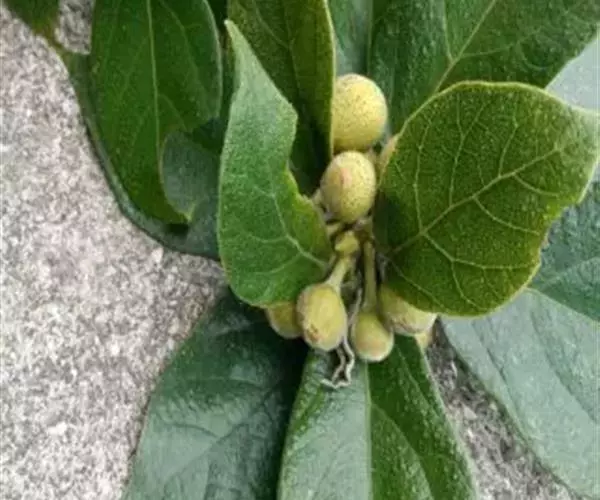 叶长圆状披针形,表面粗糙,被白色粗长柔毛。榕果近球形,被白色长柔毛,直径1-1.2厘米,顶生苞片红色,基部缢缩为柄;果梗长1-1.5厘米。