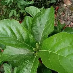 大型落叶灌木,高3-4米;枝粗壮,近无毛,疏分枝。叶倒卵形至狭倒卵形,先端急尖,具短尖头,基部圆形或浅心形,表面无毛,微粗糙,背面近光滑;叶柄长1.5-4厘米。榕果单生叶腋,球形,无毛,直径1-1.5厘米,成熟时红色,总梗细,长1-2厘米。