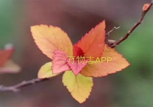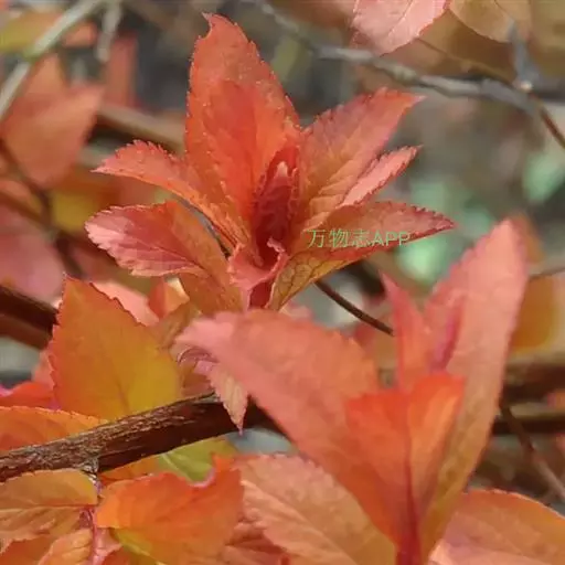 金焰绣线菊为落叶小灌木,株高60~110cm,冠幅90~120cm,老枝黑褐色,新枝黄褐色,枝 金焰绣线菊 条呈折线状,不通直,柔软。冬芽小,有鳞片,单叶互生,边缘具尖锐重锯齿,羽状脉。叶长0.8~3.0cm,宽0.5~1.6cm,叶柄0.2~0.4cm。