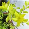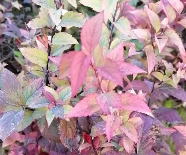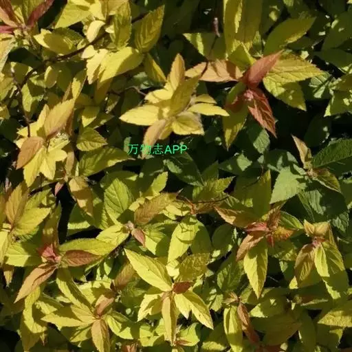 金焰绣线菊(Spiraea x bumalda cv.Gold Flame),栽培种,为落叶灌木,芽小,芽鳞2-8。单叶互生,具锯齿、缺刻或分裂,稀全缘,羽状脉,或基部具3-5出脉,叶柄短,无托叶。花两性,稀杂性;花序伞形、伞形总状、伞房状或圆锥状;萼筒钟状,萼片5,花瓣5,常圆形;雄蕊15-60,着生在花盘外缘;心皮5(3-8),离生。瞢荚果5,常沿腹缝开裂。种子数粒、细小;胚乳量或无。其叶色有丰富的季相变化,有较高的观赏价值。