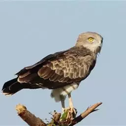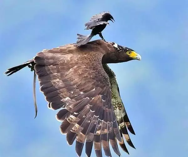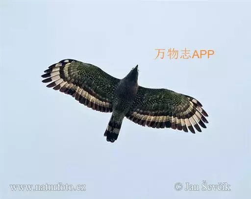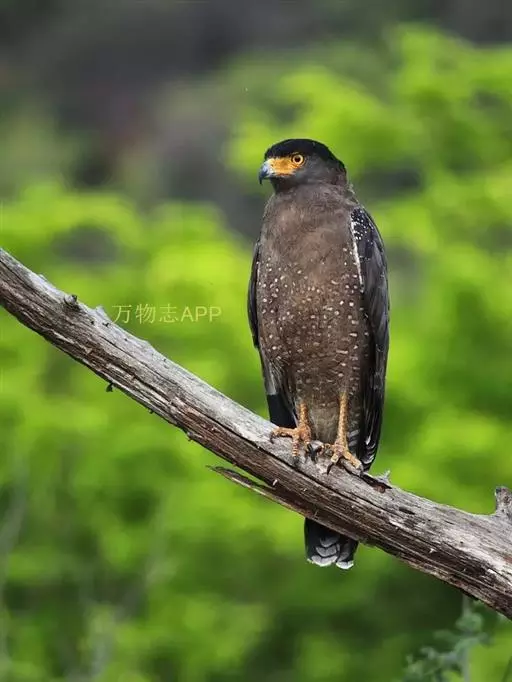 蛇雕(学名:Spilornis cheela):共有21个亚种。全长61-73厘米,大中型鹰类。头顶具黑色杂白的圆形羽冠,覆盖后头。上体暗褐色,下体土黄色,颏、喉具暗褐色细横纹,腹部有黑白两色虫眼斑。飞羽暗褐色,羽端具白色羽缘;尾黑色,中间有一条宽的淡褐色带斑:尾下覆羽白色。喙灰绿色,蜡膜黄色。跗蹠及趾黄色,爪黑色。