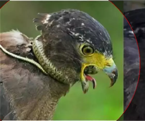 由于捉到蛇后大多是囫囵吞食,不需要撕扯,所以蛇雕的嘴没有其他猛禽发达。但它的颚肌非常强大,能将蛇的头部一口咬碎,然后首先吞进蛇的头部,接着是蛇的身体,最后是蛇的尾巴。在饲喂雏鸟的季节,成鸟捕捉到蛇后,并不全部吞下,往往将蛇的尾巴留在嘴的外边,以便回到巢中后,能使雏鸟叼住这段尾巴,然后将整个蛇的身体拉出来吃掉。