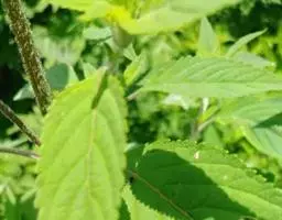 直立草本,高0.3-0.5米,具密集的须根。茎通常自中部以上分枝,钝四稜形,具槽,无毛或被疏柔毛,常呈麦秆黄色,老时变紫褐色。叶卵形或椭圆状披针形,长3-9厘米,宽1-4厘米,先端渐尖,基部楔状下延成狭翅,边缘具锯齿,上面绿色,疏被小硬毛,下面淡绿色,主沿脉上疏被小硬毛,余部散布松脂状腺点,侧脉约6-7对,与中肋两面稍明显;叶柄长0.5-3.5厘米,背平腹凸,边缘具狭翅,疏被小硬毛。