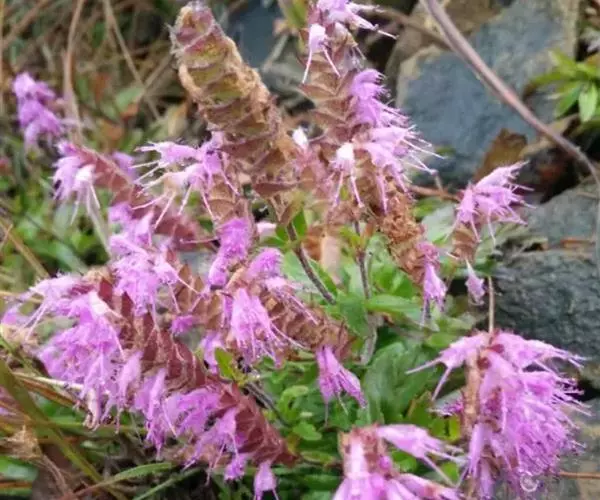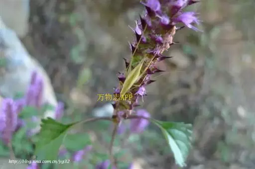 穗状花序长2-7厘米,宽达1.3厘米,偏向一侧,由多花的轮伞花序组成;苞片宽卵圆形或扁圆形,长宽约4毫米,先端具芒状突尖,尖头长达2毫米,多半退色,外面近无毛,疏布松脂状腺点,内面无毛,边缘具缘毛;花梗纤细,长1.2毫米,近无毛,序轴密被白色短柔毛。花萼钟形,长约1.5毫米,外面被疏柔毛,疏生腺点,内面无毛,萼齿5,三角形,前2齿较长,先端具针状尖头,边缘具缘毛。花冠淡紫色,约为花萼长之3倍,外面被柔毛,上部夹生有稀疏腺点,喉部被疏柔毛,冠筒自基部向上渐宽,至喉部宽约1.2毫米,冠檐二唇形,上唇直立,先端微缺,下唇开展,3裂,中裂片半圆形,侧裂片弧形,较中裂片短。雄蕊4,前对较长,外伸,花丝无毛,花药紫黑色。花柱内藏,先端2浅裂。小坚果长圆形,长约1毫米,棕黄色,光滑。花期7-10月,果期10月至翌年1月。