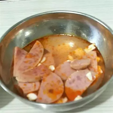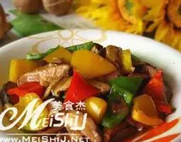 1、锅里放少许油,放进午餐肉煸炒至微黄,盛起备用 彩椒午餐肉披萨