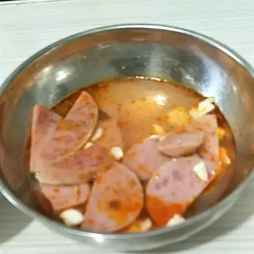 9、把午餐肉、彩椒粒撒在番茄酱上面,用手稍压一下
