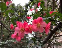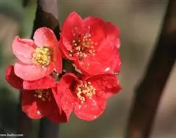 花单生,先于叶开放,直径2.5-3.5厘米;花梗极短或几无梗;萼筒钟形,被短柔毛,稀几无毛,绿色而具红色斑点;萼片卵形至长圆形,顶端圆钝,外被短柔毛;花瓣长圆状椭圆形至宽倒卵形,粉红色,罕为白色;雄蕊约20-30,花药绯红色;花柱几与雄蕊等长或稍短;子房被短柔毛。