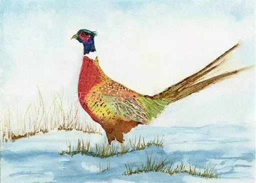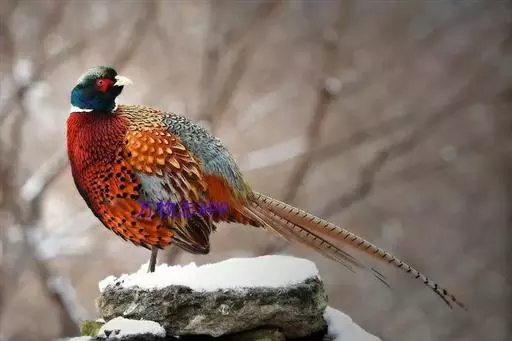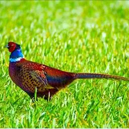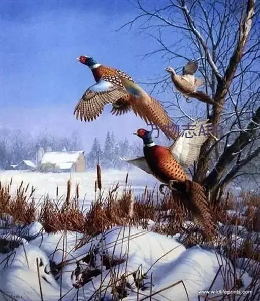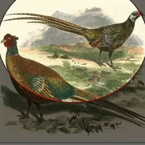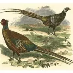 雉鸡(学名:Phasianus colchicus):共有30个亚种。体形较家鸡略小,但尾巴却长得多。雄鸟和雌鸟羽色不同,雄鸟羽色华丽,多具金属反光,头顶两侧各具有一束能耸立起而羽端呈方形的耳羽簇,下背和腰的羽毛边缘披散如发状;翅稍短圆;尾羽18枚,尾长而逐渐变尖,中央尾羽比外侧尾羽长得多,雄鸟尾羽羽缘分离如发状;雄鸟跗跖上有短而锐利的距,为格斗攻击的武器,近年来还发现距的长度与其所拥有的配偶数量明显相关,是雌鸟选择配偶的一个重要标准。