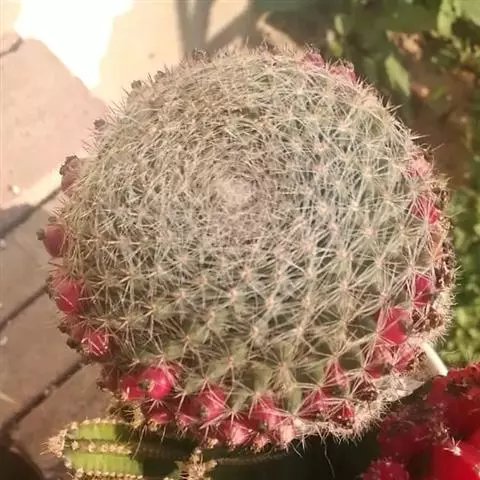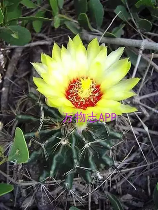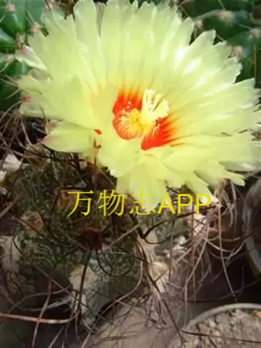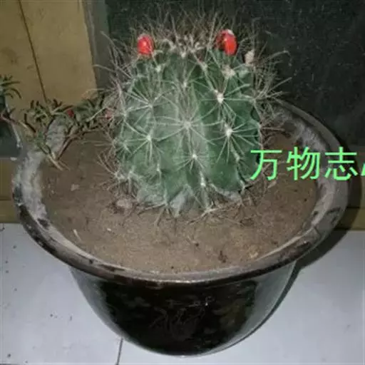 茎球形至短圆筒形,高15-30厘米,径8-12厘米,浓绿色,顶部凸起,13棱,棱脊高白色带褐晕,刺座排列密,中刺1-3枚,长1.5-2厘米,淡红褐色,边刺6-16枚,向外开展,长约4厘米,外围被白绵毛。