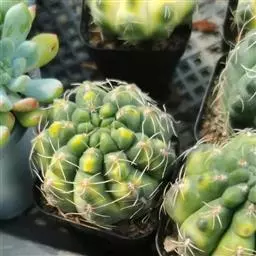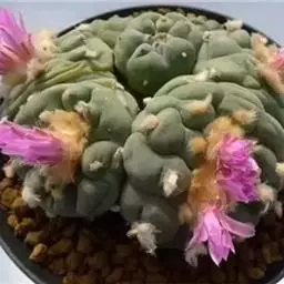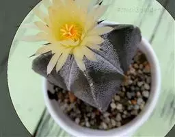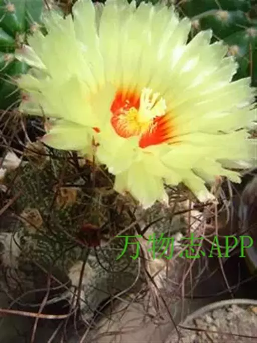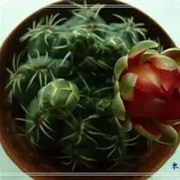 江守玉为仙人掌科强刺球属,植株扁圆形至球形,后成圆柱状,体色灰绿,刺座上附生白色绒毛,花橙黄色,漏…