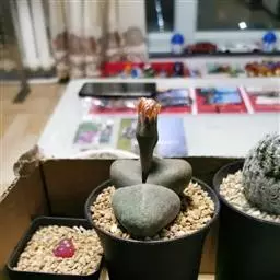 荒玉为番杏科生石花属,原产南非。株体呈白粉色,表面布满凹凸纹路,凹陷处为红褐色,每年秋季开黄花。