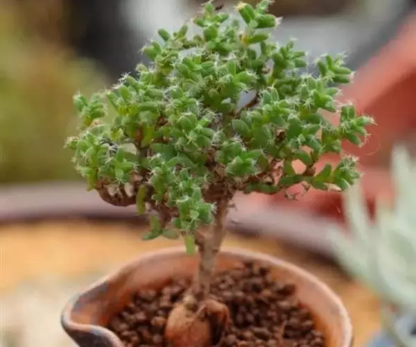 多年生肉质矮灌木,株高7-12厘米。灰白色,茎干膨大、肥厚且多汁。分枝性强,枝条黄褐色,嫩枝绿色。绿色纺锤形小叶对生,小叶长0.8-2厘米。叶端丛生白色短细毛。小花桃红色,着生于枝条顶部。花期舂、秋季。 姬红小松