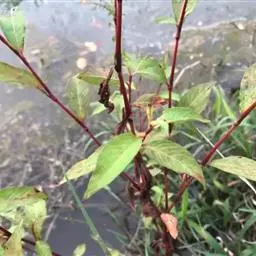 水蓼(学名:Polygonum hydropiper L.)是蓼科,蓼属一年生草本植物,高可达70厘米。茎直立,多分枝,叶片披针形或椭圆状披针形,两面无毛,被褐色小点,具辛辣味,叶腋具闭花受精花;托叶鞘筒状,膜质,褐色,总状花序呈穗状,顶生或腋生,花稀疏,苞片漏斗状,绿色,边缘膜质,每苞内具5花;花梗比苞片长;花被绿色,花被片椭圆形,柱头头状。瘦果卵形,5-9月开花,6-10月结果。