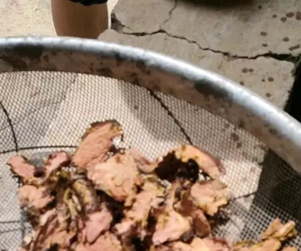 5、 渍入味的牛肉片,放在炭火上烤熟后,将渍汁分装在各人的小碗里,蘸汁。