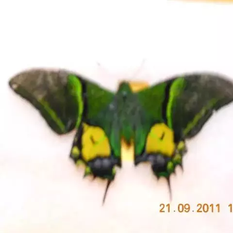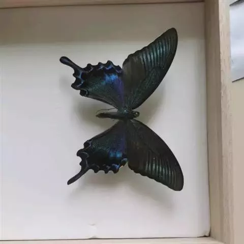 天堂凤蝶翅展可达105mm。前、后翅自基角至后缘约1/2~2/3端为纯净的宝蓝色,后角至后缘1/3…