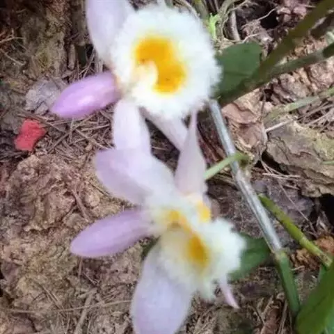 总状花序从具叶或落了叶的老茎上部发出,通常具2-5朵花;花序轴多少回折状弯曲,长3-4厘米;花序柄长5-10毫米,基部被3-4枚短的膜质鞘;花苞片狭披针形,长3-6毫米,先端锐尖;花梗和子房长2-4厘米;花黄绿色,后来转变为乳黄色,开展;中萼片卵状长圆形,长1.5-1.7厘米,宽5-6毫米,先端急尖或稍钝,具5条脉;侧萼片多少斜三角形,与中萼片等长,基部歪斜,宽1-1.3厘米,先端急尖。
