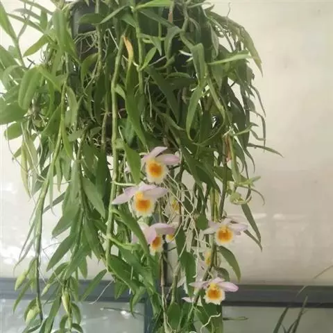 美花石斛是兰科石斛属多年生草本。茎柔弱,斜立或下垂,呈细圆柱形,有时分枝;叶互生于茎上,…