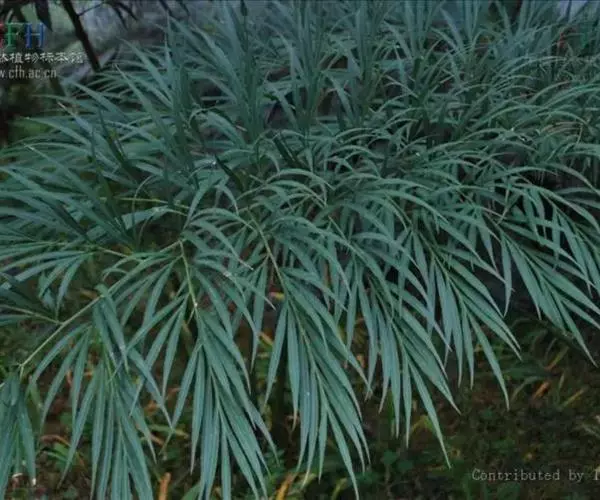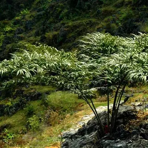 常绿木本植物,树干粗壮,圆柱形, 树干高20-40厘米,直径10-20厘米,褐灰色,叶片只有1片,稀2片,顶生,直立,长达3.5米,宽0.7米。羽片三回羽状,馒形。具12-18枚近对生的一回羽片,以60-90°夹角丛主轴展开,横断面观,以100-130°夹角从主轴上向上张开成龙骨状;一回羽片披针形,中下部一对最长,长35-45厘米,宽12-15厘米,向着两端的逐渐变短,长15-30厘米,宽5-10厘米。具7-11枚互生的二回羽片,横断面观,以95-110°夹角从次级轴上张开成龙骨状。二回羽片扇形或倒三角形,长10-18厘米,宽4-14厘米,(2-)3-5次二歧分枝,在中央,尤在下半部形成合轴,柄长0.5-4厘米。小叶(小羽片)革质,倒卵状条形,长7-12厘米,宽1.0-1.5厘米,先端渐尖,基部渐狭,并下延1.5- 4.0厘米;上面具光泽,深绿色,下面淡绿色,中脉两面稍隆起,下面后变无毛,边缘平或微波状。叶柄近圆柱状,长达2米,粗达2.5厘米;约40对,着生于柄基部至近顶端,圆锥状,微扁,长3-5毫米,刺间距3-5厘米。球花(果)未见。