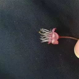 玉缀茎匍匐生长,故常悬挂栽培任其下垂。叶片披针形弯曲如香蕉,叶端尖,长度约2cm,叶色青绿带有透明感,叶表裹着一层粉,看起来非常粉嫩。花梗从枝端的叶腋凑出,通常会从不同叶腋抽生出几个花梗,一个花梗一朵花,花朵钟形桃红色,玲珑精致。