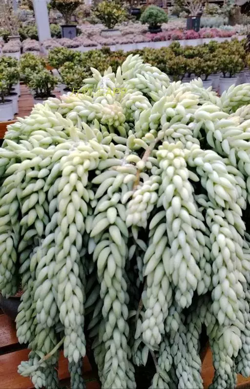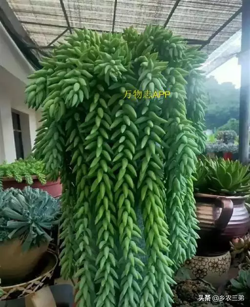 玉缀群生 玉缀 Sedum morganianum 名字起源于日本,日本考古学家在挖掘古坟时,发现一些由玉或玛瑙等宝石制成的玉饰,这些玉饰的造型弯曲如勾,所以便称为“勾玉”,这在日本漫画、小说中相当常见。后来多肉植物界引进玉缀时,观察她叶片的形状很像勾玉,而整串的叶片犹如成串的勾玉,所以这植物便命名为玉つづり,つづり日文就是“缀”,缀玉成串的多肉植物便是“玉缀”,很好听且达意的名字。当然引申意思也可以称为“玉串”或“玉帘”,因此玉缀的别名也有玉帘、玉串、玉珠帘。
