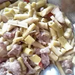 2、咸笋切片,葱切段,猪头肉切片。