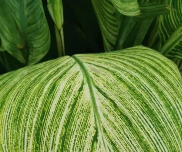 金脉美人蕉叶片淡黄色,叶脉绿化,叶缘具红边,全缘,大花美人蕉之变种