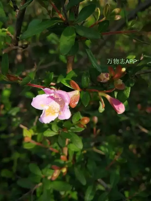 花生于侧生短枝顶端叶腋,由未伸长的带叶花枝构成聚伞花序状;萼筒细长,萼檐2裂,裂片椭圆形,长约1厘米,与萼筒等长;花冠红色,狭钟形,5裂,稍呈二唇形,上唇3裂,下唇2裂,筒基部两侧不等,具浅囊;雄蕊4枚,着生于花冠筒中部,花药长柱形,花丝白色;花柱与雄蕊等长,柱头头状,稍伸出花冠喉部。