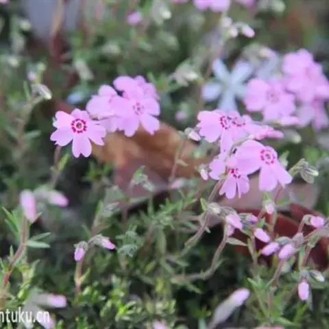 小天蓝绣球(学名:Phlox drummondii Hook.)即福禄考。花荵科一年生草本,茎直立。下部叶对生,上部叶互生,顶端锐尖,叶面有柔毛;无叶柄。圆锥状聚伞花序顶生,有短柔毛,花梗很短;花萼筒状,萼裂片外面有柔毛,结果时开展或外弯;花冠高脚碟状,淡红、深红、紫、白、淡黄等色,裂片圆形,比花冠管稍短;雄蕊和花柱比花冠短很多。蒴果椭圆形。种子长圆形,褐色。