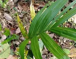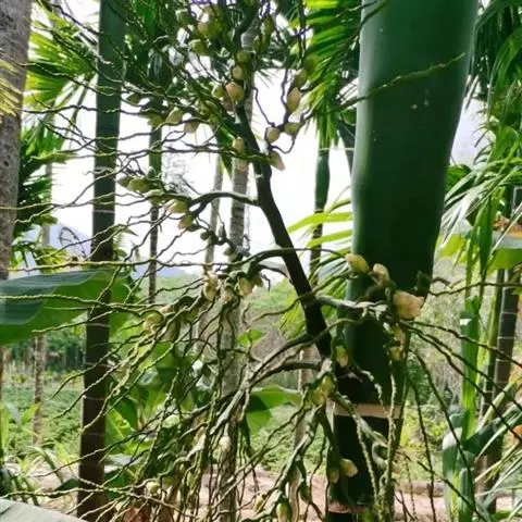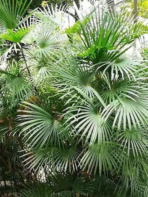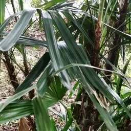细叶棕竹,灌木,茎细如竹,多数聚生,有网状叶鞘。叶半圆形,掌状深裂,裂片狭长,阔线形,软垂,裂片7…