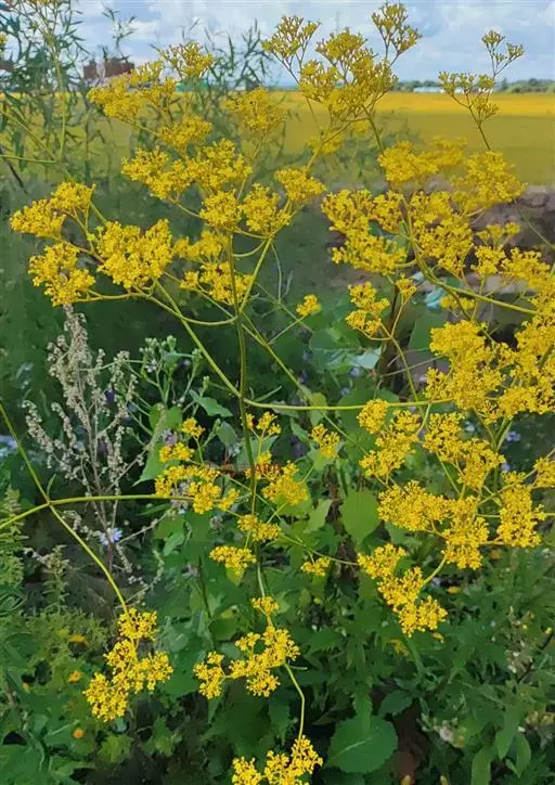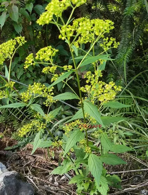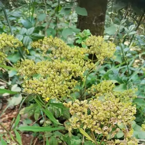 糙叶败酱( Patrinia rupestris Juss.subsp.scabra H.J.Wang),败酱科植物,多年生草本,茎丛生,茎上部多分枝,叶对生,裂片倒披针形、狭披针形或长圆形,聚伞花序顶生,呈伞房状排列,花小,黄色,花冠合瓣,果实翅状,卵形或近圆形,种子位于中央。