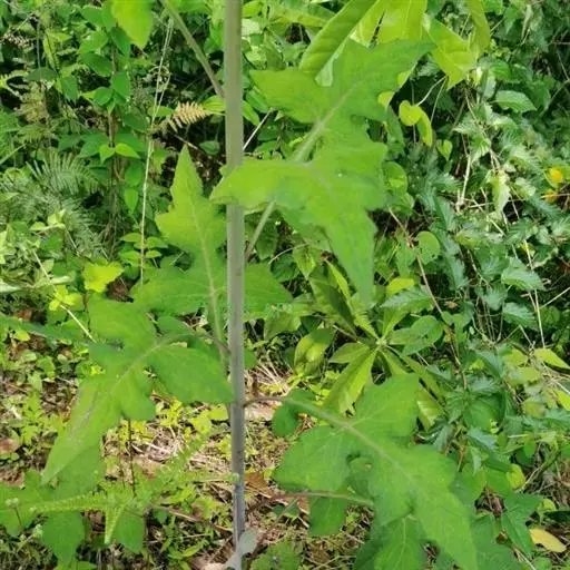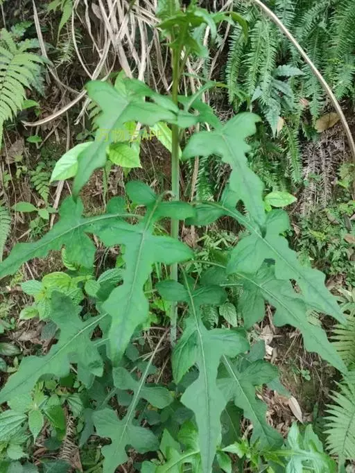 7 基生叶花期枯萎;下部及中部茎叶大头羽状半裂或深裂或几全裂,极少羽状深裂或几全裂,有长4-7厘米的狭或宽翼柄,顶裂片大,宽三角状戟形、三角状心形、三角形或宽卵状三角形,长5.5-15厘米,宽5.5-15厘米,顶端急尖,边缘有大或小锯齿或重锯齿,齿顶及齿缘有小尖头,基部戟形或心形或平截,极少顶裂片与侧裂等大或几等大,披针形或不规则菱状披针形,长4-11厘米,宽3-7厘米,侧裂片1-2(3)对,椭圆形,下方的侧裂片更小,三角状锯齿形,全部侧裂顶端圆形或急尖,有小尖头,边缘有小尖头状锯齿;羽轴有宽或狭翼;上部茎叶小,不裂,戟形、卵状戟形、披针形或长椭圆形,有短翼柄或无柄;全部叶两面无毛。