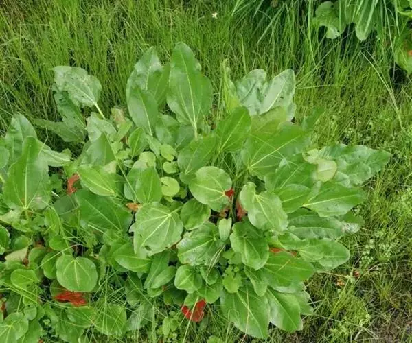 基生叶4-6片,茎生叶及叶状苞片多数;下部叶卵形倒卵状椭圆形,长9-14厘米,宽6.5-9厘米,稀稍大,顶端圆钝,基部近心形或圆形,全缘,基出脉5-7条,一般中间3条特别粗壮,两面均无毛,稀于主脉或叶缘上具短乳突状毛;叶柄与叶片近等长或稍长,半圆柱状,无毛;托叶鞘大,长约7厘米,内外两面均无毛,棕色,干后膜质;上部叶及叶状苞片较窄小叶片长卵形,一般为浅绿色,干后近膜质;叶柄亦较短或无柄。