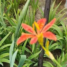 射干(学名:Belamcanda chinensis (L.)Redouté)为多年生草本。根状茎为不规则的块状,斜伸,黄色或黄褐色;须根多数,带黄色。茎直立,茎高1~1.5米,实心。