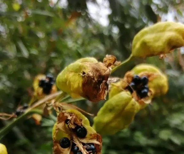 蒴果倒卵形或长椭圆形,黄绿色,长2.5~3厘米,直径1.5~2.5厘米,顶端无喙,常残存有凋萎的花被,成熟时室背开裂,果瓣外翻,中央有直立的果轴;种子圆球形,黑紫色,有光泽,直径约5毫米,着生在果轴上。花期6~8月,果期7~9月。 图版42: 1-5