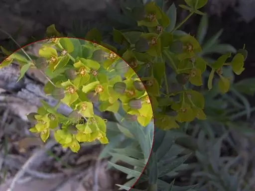花序单生于二歧分枝顶端,无柄;总苞杯状,高约3.5mm,直径3.5~4.0mm,边缘4裂,裂片半圆形,边缘具不明显的缘毛;腺体4,半圆形或肾状圆形,淡褐色。雄花多数,伸出总苞之外;雌花1枚,具较长的子房柄,柄长3~5 (6)mm;子房幼时被较密的瘤状突起;花柱3,分离;柱头2裂。