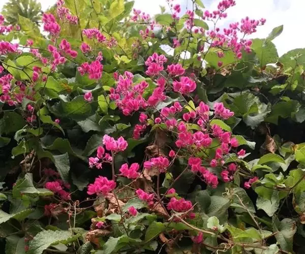 珊瑚藤(学名:Antigonon leptopus Hook. et Arn.)是蓼科珊瑚藤属植物,多年生攀援藤本,长达10米。茎自肥厚的块根发出,稍木质。叶有短柄;叶片卵形或卵状三角形。花序总状,顶生或腋生,花序轴顶部延伸变成卷须。瘦果卵状三角形,长约10毫米,平滑,包于宿存的花被内。