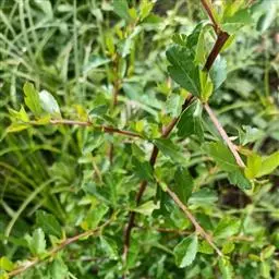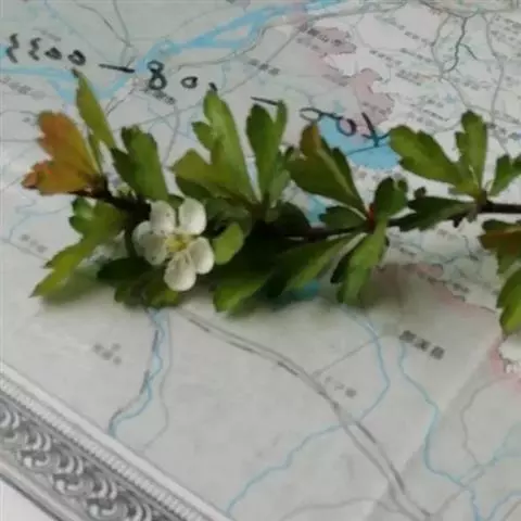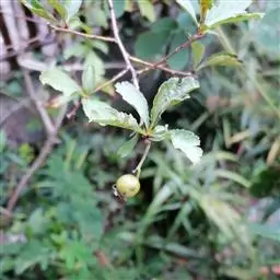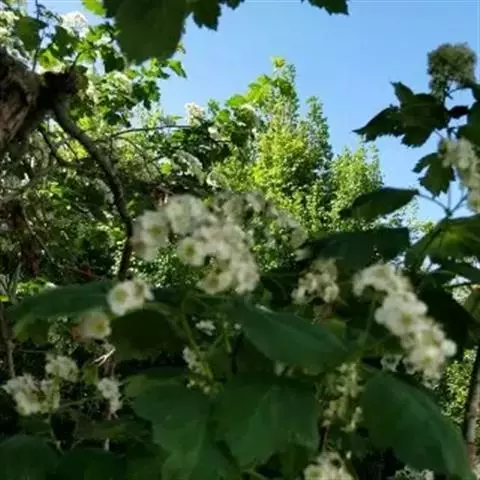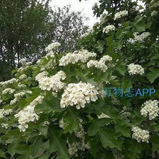 山里红 落叶乔木,植株生长茂盛。高达6米,树皮粗糙,暗灰色或灰褐色;刺长约1-2厘米,有时无刺;小枝圆柱形,当年生枝紫褐色,无毛或近于无毛,疏生皮孔,老枝灰褐色;冬芽三角卵形,先端圆钝,无毛,紫色。