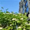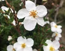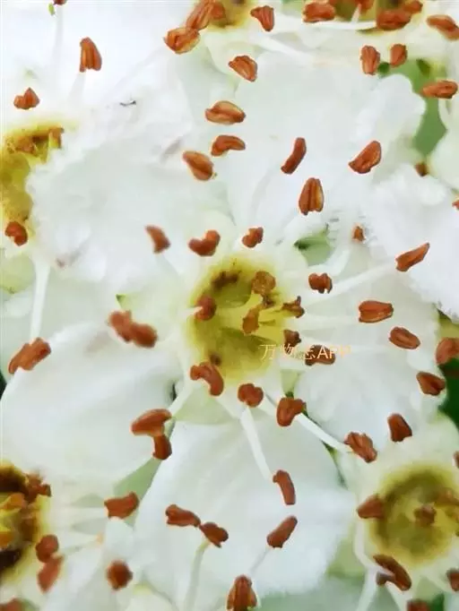 伞房花序具多花,直径4-6厘米,总花梗和花梗均被柔毛,花后脱落,减少,花梗长4-7毫米;苞片膜质,线状披针形,长约6-8毫米,先端渐尖,边缘具腺齿,早落;花直径约1.5厘米;萼筒钟状,长4-5毫米,外面密被灰白色柔毛;萼片三角卵形至披针形,先端渐尖,全缘,约与萼筒等长,内外两面均无毛,或在内面顶端有髯毛;花瓣倒卵形或近圆形,长7-8毫米,宽5-6毫米,白色;雄蕊20,短于花瓣,花药粉红色;花柱3-5,基部被柔毛,柱头头状。