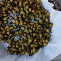 野生山里红果提早采种出苗快,即在生理成熟期内采收,8月中旬-9月上旬以果实初着色期采果较为适宜,利于出苗。将采下的果实堆积,待果肉腐烂变软,搓碎用清水淘洗干净,筛选出饱满健康的种子,之后用50℃热水浸种,一边加热水一边搅拌,10分钟后捞出,马上用凉水降温,并浸泡24小时。浸泡后捞出,放置阳光下暴晒,1小时翻动1次,充分晾晒24小时后,再浸泡在水中,第二天接着进行晾晒,反复进行,约有60%-70%的种壳开裂时,即可进行沙藏。按种子和沙子1:3比例进行混合,混拌均匀,放入挖好的坑内,沙藏坑要选择向阳背风处,深1.2米,宽85厘米,长度视种子多少而定,将混好的种沙放入坑底摊平,厚度6-8厘米,在种沙铺好后,上面放一层草帘,在坑的中间插一束秫秸进行通风换气,然后将土填回坑内,并稍高于地面,以防积水。种子沙藏时间170-200天,次年4月初取出,待用。
