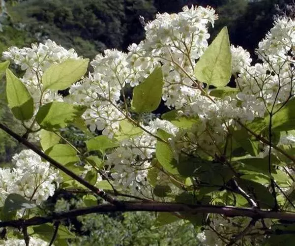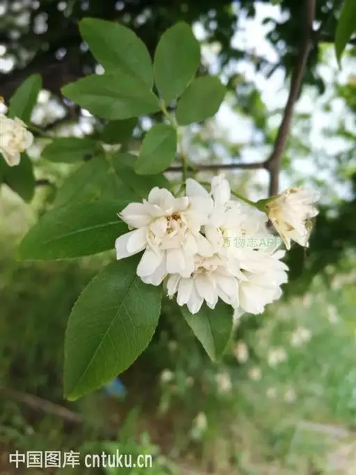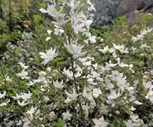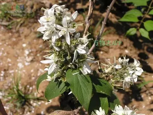 灌木,高约2m;老枝紫褐色或灰褐色,无毛,表皮片状脱落;花枝开始极短,以后延长达4cm,具2~4叶,黄褐色,被具中央长辐线星状毛。叶纸质,卵状菱形或椭圆状卵形,长2~5.5cm,宽1~3.5cm,先端急尖,基部楔形或阔楔形,边缘具大小相间或不整齐锯齿,上面被4~6辐线星状毛,下面灰白色,被7~11辐线星状毛,毛稍紧贴,沿叶脉具中央长辐线,侧脉每边5~6条;叶柄长1~4mm,被星状毛。