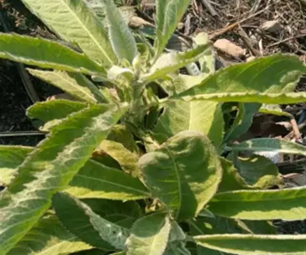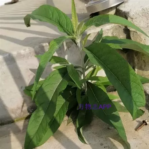 叶:下部叶宽椭圆形或长圆状披针形,长22-25厘米,宽8-10厘米,基部渐狭,具柄,柄两侧有3-5对狭线形的附属物,顶端短尖或钝,边缘有细锯齿,上面被柔毛,下面被淡褐色或黄白色密绢状棉毛,中脉在下面凸起,侧脉10-15对,弧状上升,不抵边缘,有不明显的网脉;上部叶长圆状披针形或卵状披针形,长7-12厘米,宽1.5-3.5厘米,基部略尖,无柄或有短柄,柄的两侧常有1-3对狭线形的附属物,顶端渐尖,全缘、具细锯齿或羽状齿裂,侧脉斜上升,通常与中脉成锐角。