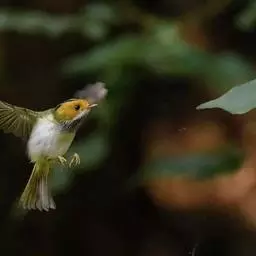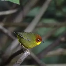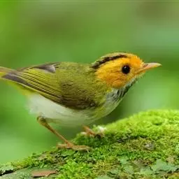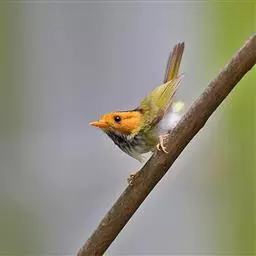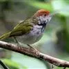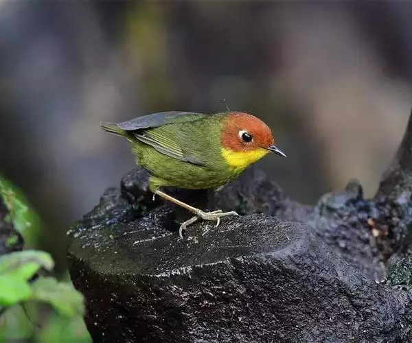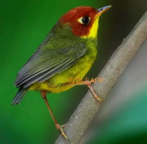 棕脸鹟莺:体长10厘米,是一种色彩亮丽而有特色的莺鸟。头栗色,具黑色侧冠纹。上体绿,腰黄色。下体白,…