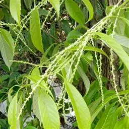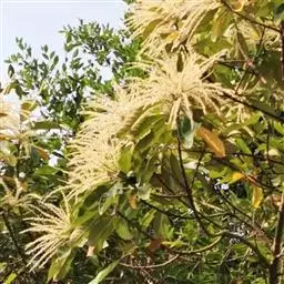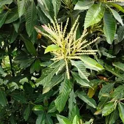 米槠〔学名:Castanopsis carlesii (Hemsl.)Hay.〕:壳斗科,锥属乔木,高可达20米,芽小,叶披针形,叶全缘,或兼有少数浅裂齿,嫩叶叶背有红褐色或棕黄色稍紧贴的细片状蜡鳞层,成长叶呈银灰色或多少带灰白色;雄圆锥花序近顶生,花序轴无毛或近无毛,果序无毛,壳斗近圆球形或阔卵形,坚果近圆球形或阔圆锥形,熟透时无毛,果脐位于坚果底部。3-6月开花,次年9-11月结果成熟。