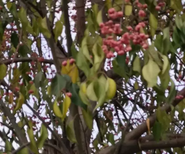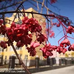 白杜(学名:Euonymus maackii Rupr.)卫矛科小乔木,高达6米。叶卵状椭圆形、卵圆形或窄椭圆形,长4---8厘米,宽2-5厘米,先端长渐尖,基部阔楔形或近圆形,边缘具细锯齿,有时极深而锐利;叶柄通常细长,但有时较短。淡白绿色或黄绿色,直径约8毫米;小花梗长2. 5-4毫米;雄蕊花药紫红色,花丝细长,葫果倒圆心状,成熟后果皮粉红色;种子长椭圆状,种皮棕黄色,假种皮橙红色,全包种子,成熟后顶端常有小口。