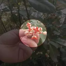 聚伞花序3至多花,花序梗略扁,长1-2厘米;花4数,淡白绿色或黄绿色,直径约8毫米;小花梗长2.5-4毫米;雄蕊花药紫红色,花丝细长,长1-2毫米。蒴果倒圆心状,4浅裂,长6-8毫米,直径9-10毫米,成熟后果皮粉红色;种子长椭圆状,长5-6毫米,直径约4毫米,种皮棕黄色,假种皮橙红色,全包种子,成熟后顶端常有小口。花期5-6月,果期9月。
