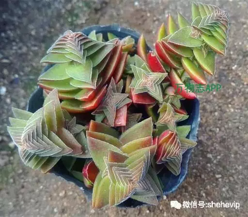 多年生肉质草本植物,矮小的植株呈丛生状,直径1.6厘米左右,高仅5~8厘米,直立生长,有时也具匍匐性。叶无柄,对生,密集排列成四列,叶片心形或长三角形,基部大,逐渐变小,顶端最小,接近尖形。叶色浓绿,在冬季和早春的冷凉季节或阳光充足的条件下,叶呈红褐或褐色,叶缘有白色角质层。整个植株叶片排列紧密而整齐,由基部向上逐渐变小,形成宝塔状。
