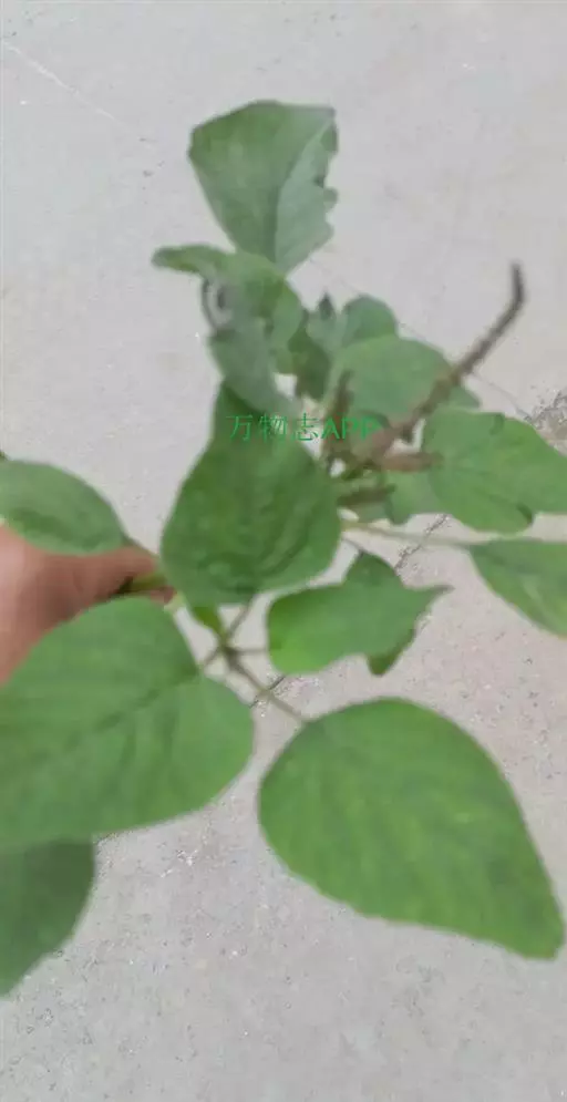 一年生草本,高40-80厘米,全体无毛;茎直立,有不显明棱角,稍有分枝,绿色或带紫色。叶片卵形、卵状矩圆形或卵状椭圆形,长3-9厘米,宽2。5-6厘米,顶端尖凹或凹缺,少数圆钝,有1芒尖,基部宽楔形或近截形,全缘或微呈波状缘;叶柄长3-6厘米,绿色或带紫红色。