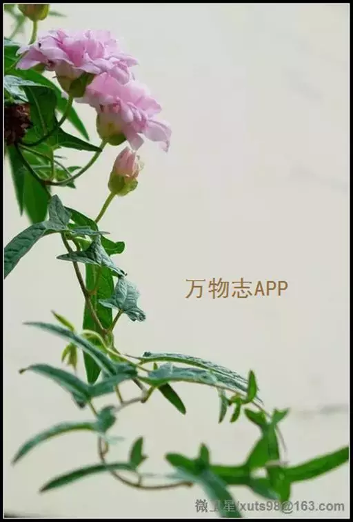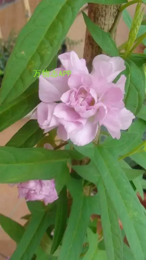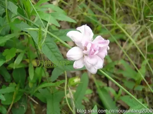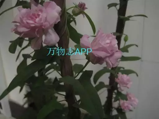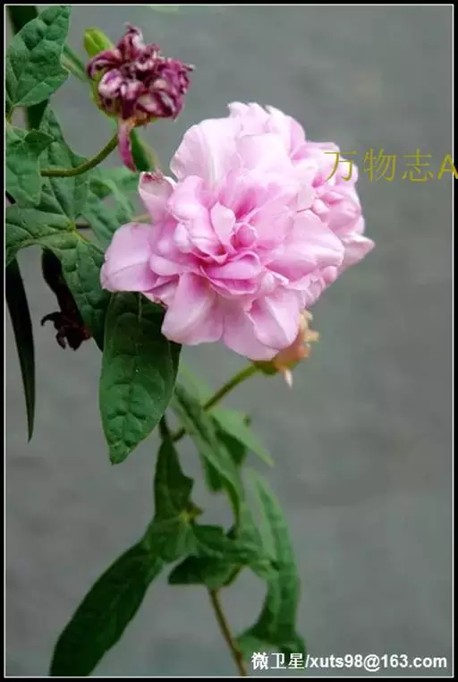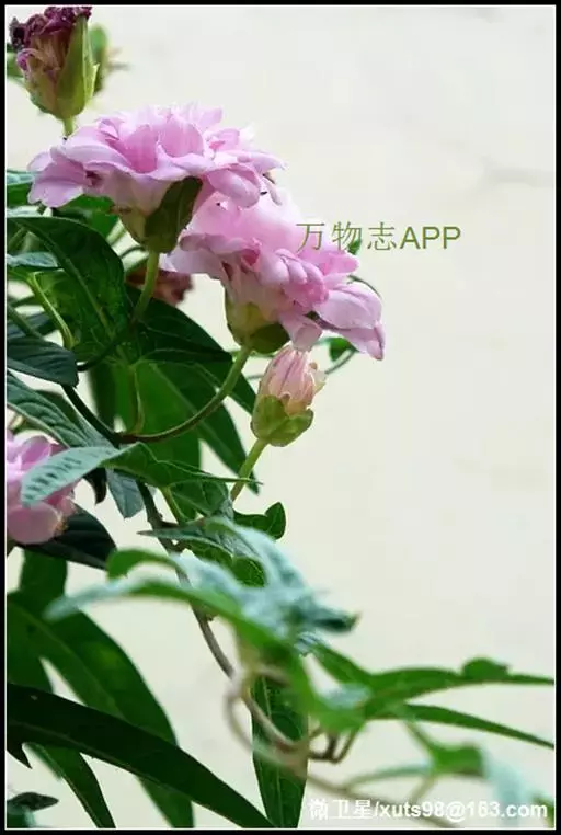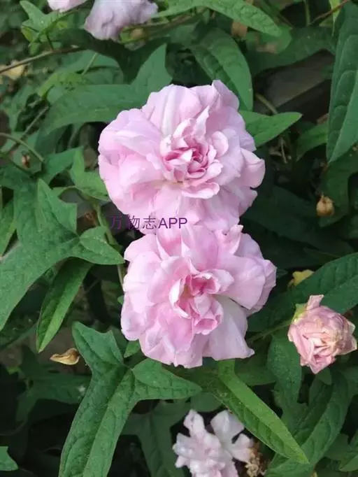 茎左旋缠绕,,主蔓粗度可达0.3cm~0.4cm,分枝可达5~7个,枝节长2cm~3cm,单叶互生,叶柄长2cm~3cm,叶长6cm~8cm,宽1.5cm,全缘。叶基部向两侧派生出1.5~2cm长片连体叶,小叶茎部微呈两裂,植物学称戟形叶。花柄长5cm~8cm,莲花形花座花形似牡丹,花粉色,重瓣( 40~50个花瓣)撕裂状,形状不规则,花瓣裂片向内变狭,没有雄蕊和雌蕊。花色艳丽,叶形美观。当年可长高达4m~5m, 当年栽植当年开花, 一节一花, 每花开放达3 天, 最盛时每株可日开花近百朵,6 月中旬始花, 直至上冻时蔓上仍有许多花蕾。